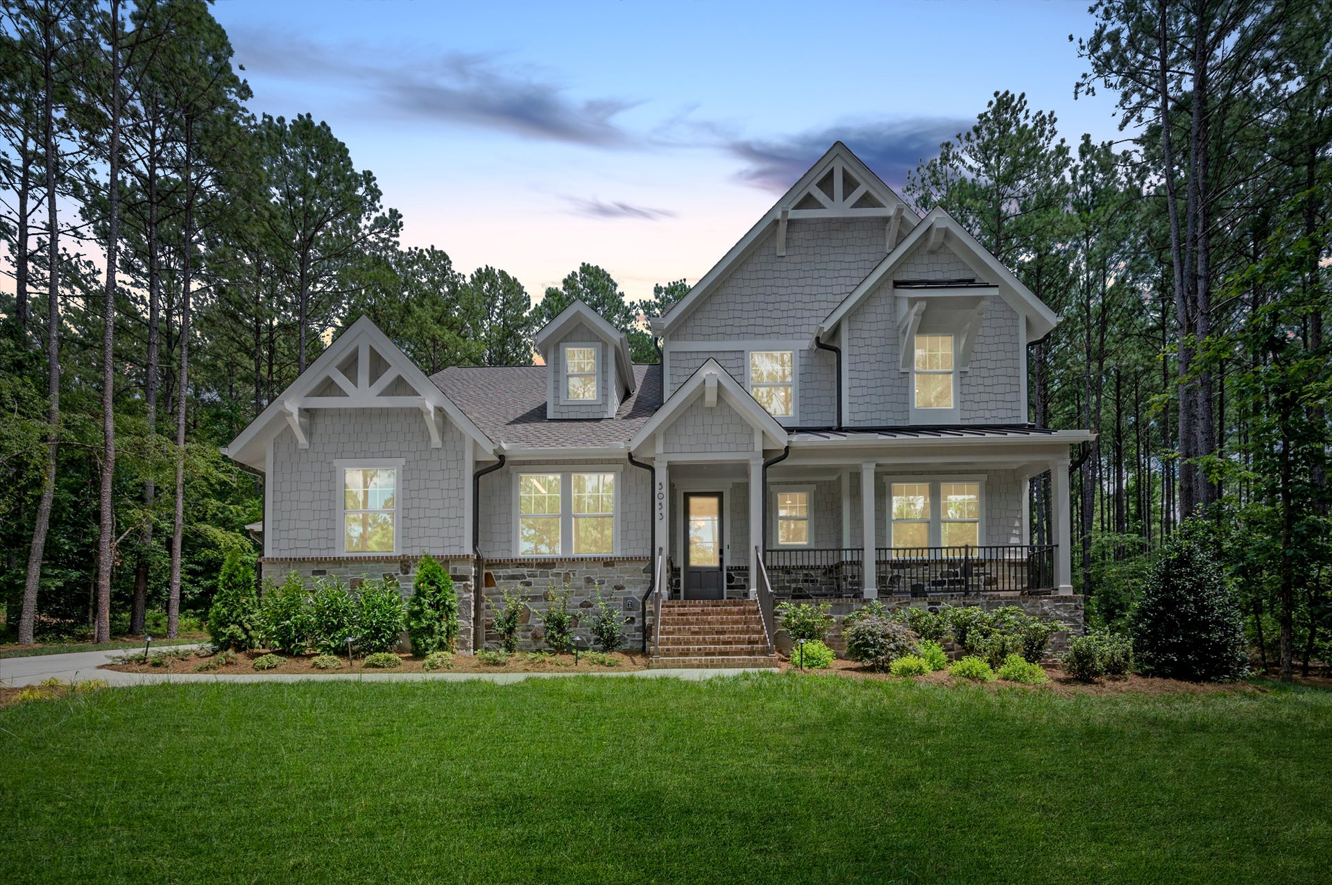 Two-story white brick home with gray shutters and metal roof accents on wooded lot