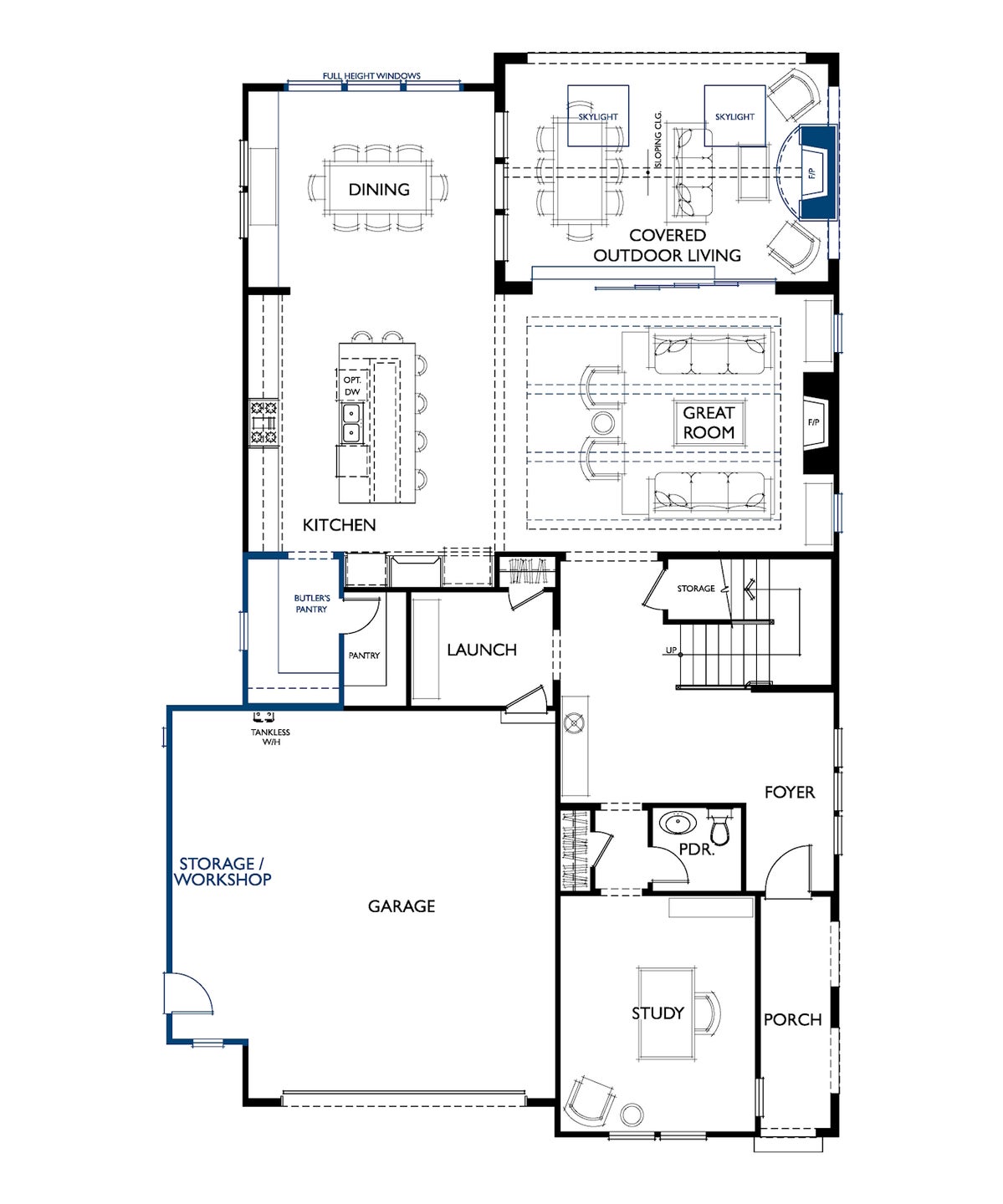 21’ by 17’ with an 11’ ceiling, the Great Room truly lives its size. Slide or stack open the wall of glass doors and living extends outside to a similarly sized Covered Outdoor Living Area. Everyone says this room changes how you live each day.