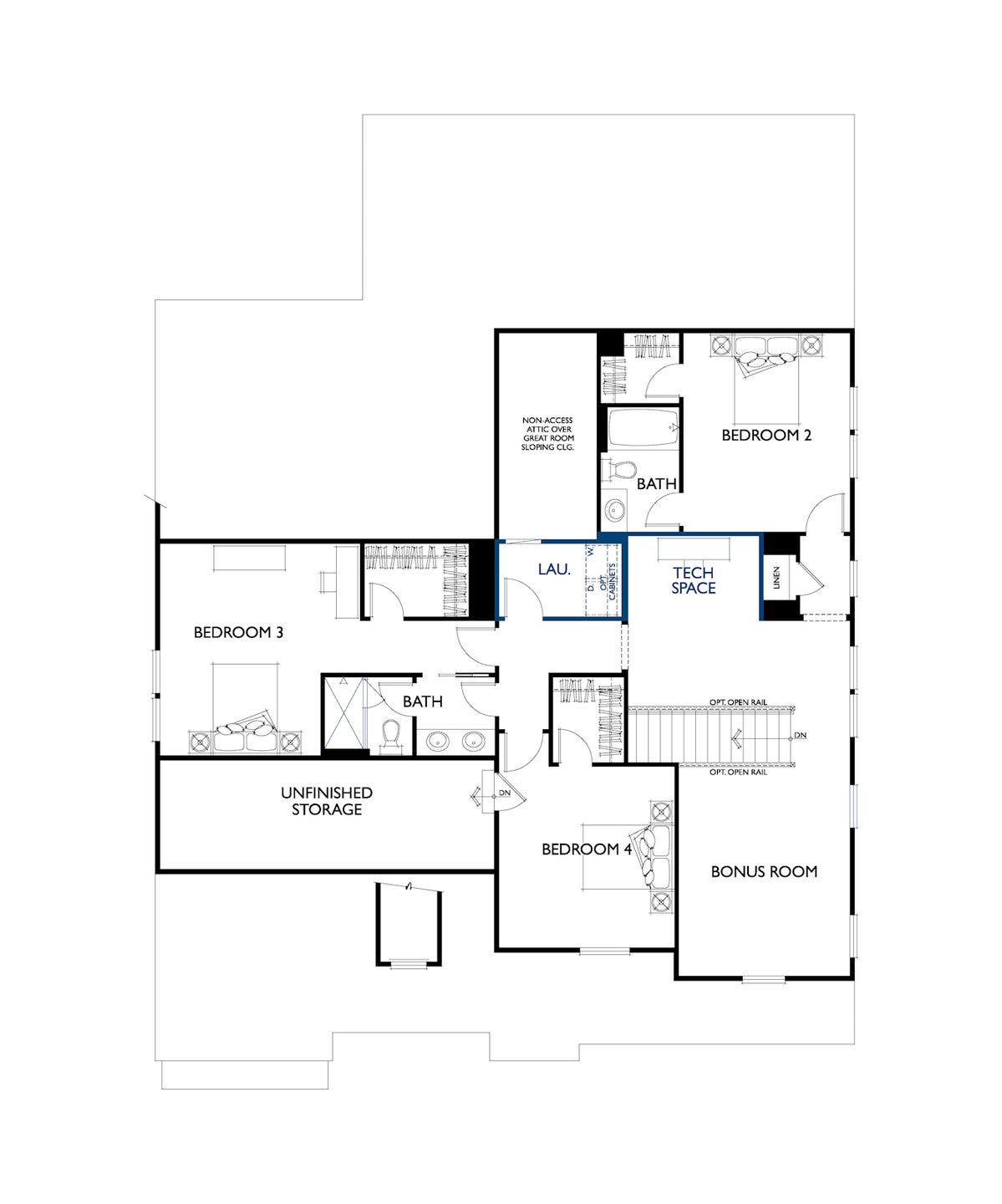 The Marin-Expanded lives large and features flexibility. The main floor features a vaulted living/dining area, open to the kitchen, with an amazing 30' wide covered outdoor living room, bringing the outdoors in. You will enjoy the feel of being outdoors and sharing space for entertaining or causal nights with family no matter whether enjoying the view from the kitchen, great room or dining. The primary suite is private and tucked away for a true retreat feel, with expansive bath and laundry room in the closet. Private Guest Suite with full bath/shower on the main level. Upstairs are three bedrooms with an open loft/bonus, a second laundry, plus a tech space and unfinished storage.